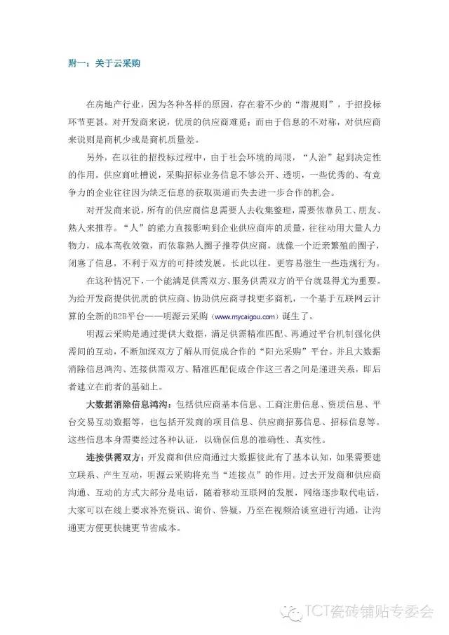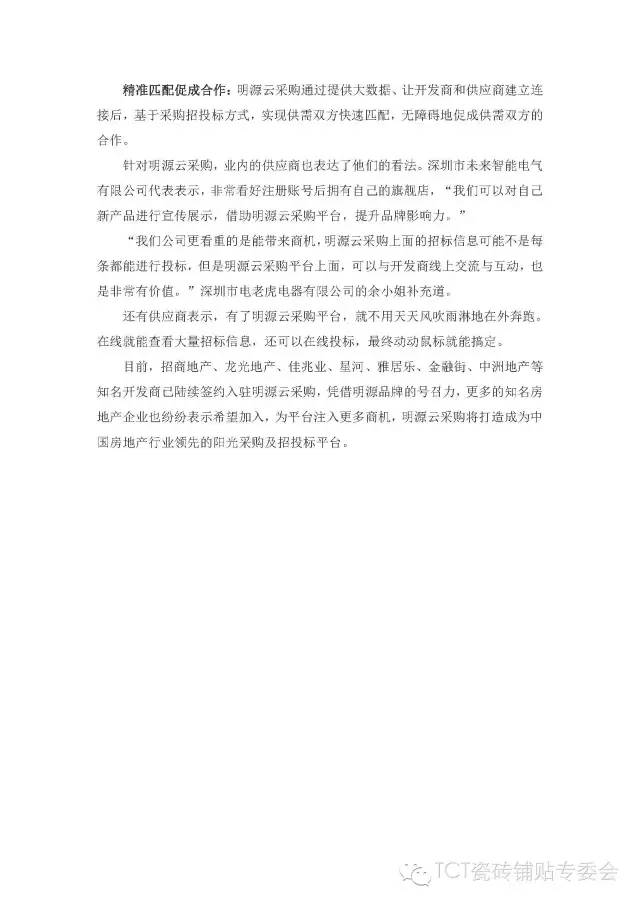 為了幫助會(huì)員企業(yè)借助互聯(lián)網(wǎng)的力量實(shí)現(xiàn)營(yíng)銷突圍,更為便捷、高效的獲得跟房地產(chǎn)項(xiàng)目采購(gòu)商合作的機(jī)會(huì)。中國(guó)陶瓷工業(yè)協(xié)會(huì)瓷磚粘貼技術(shù)專業(yè)委員會(huì)(簡(jiǎn)稱“TCT協(xié)會(huì)“)與 “明源云采購(gòu)”達(dá)成戰(zhàn)略合作。