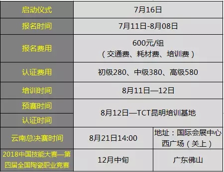 “2018中國技能大賽—第四屆全國陶瓷職業(yè)技能競賽”正式拉開序幕,本次大賽的云南賽區(qū)預選賽將由“香港易高新型砂漿股份有限公司云南分公司”組織承辦,獲獎選手將有機會代表云南賽區(qū)參加2018中國技能大賽—第四屆陶瓷技能競賽總決賽,為云南爭光。