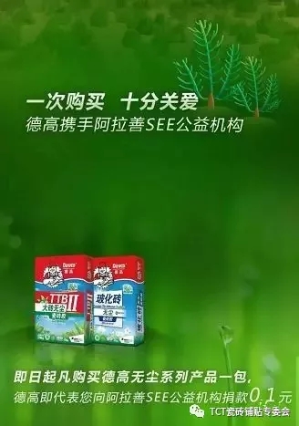 德高中國(guó)承諾,即日起消費(fèi)者凡購(gòu)買(mǎi)德高無(wú)塵瓷磚膠產(chǎn)品一包,德高中國(guó)即向阿拉善SEE機(jī)構(gòu)捐款0.1元,用于生態(tài)環(huán)境的保護(hù)。
