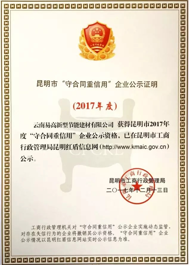 近日,昆明市工商紅盾信息網(wǎng)公示了“昆明市獲得國(guó)家級(jí)2017年度守合同重信用企業(yè)公示資格名單”,香港易高云南公司等企業(yè)榜上有名,由昆明市行政工商管理局制作頒發(fā)的《“守合同重信用”企業(yè)公示證明》也發(fā)放到位。