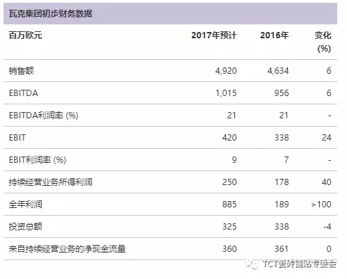 2017財(cái)年瓦克集團(tuán)持續(xù)經(jīng)營的業(yè)務(wù)所得利潤提高了40%,約達(dá)2.50億歐元(2016年:1.78億歐元)。根據(jù)初步統(tǒng)計(jì)結(jié)果,瓦克集團(tuán)2017財(cái)年全年利潤達(dá)8.85億歐元(2016年:1.89億歐元),其中包括2017年第一季度來自終止經(jīng)營的業(yè)務(wù)的6.35億歐元的利潤,即因世創(chuàng)電子材料脫離瓦克集團(tuán)帶來的盈利以及世創(chuàng)電子材料2017年第一季度的利潤。