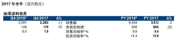 油漆和涂料業(yè)務(wù)2017年業(yè)績(jī)表現(xiàn):