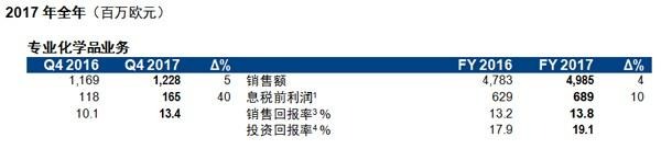 專(zhuān)業(yè)化學(xué)品業(yè)務(wù)2017年業(yè)績(jī)表現(xiàn):