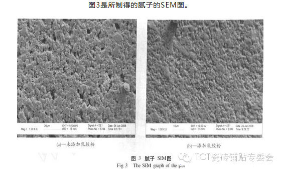 通過對比是否添加可再分散乳膠粉所制得的膩子SEM圖可以看出:圖3(a)中,無機材料粘結得不夠完整,存在很多空隙,且空隙大小分布不均勻,因而其粘結強度不夠理想。體系中大量存在的空隙使水容易滲入,從而吸水率較大。而圖3(b)中,乳膠粉再分散后的乳液聚合物基本能填補膩子體系中的空隙,形成完整的膜,從而能將整個膩子體系中無機材料部分粘結得比較完整,且基本不存在空隙,因而能顯著降低膩子吸水率。綜合乳膠粉對粘結強度及膩子耐水性的影響,以及對乳膠粉價格方面的考慮,乳膠粉添加量為3%~4%最合適。