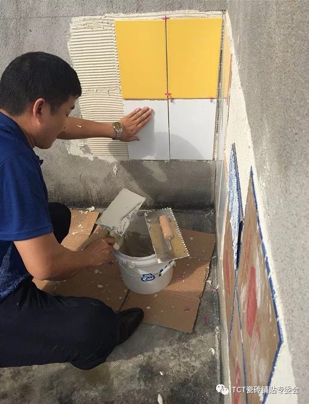 把瓷磚粘貼在墻上,并加以外力輕輕壓平