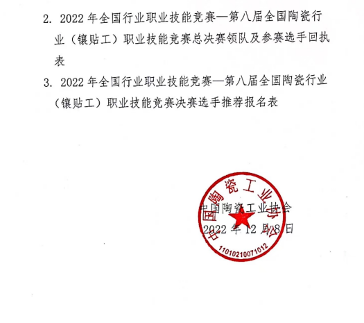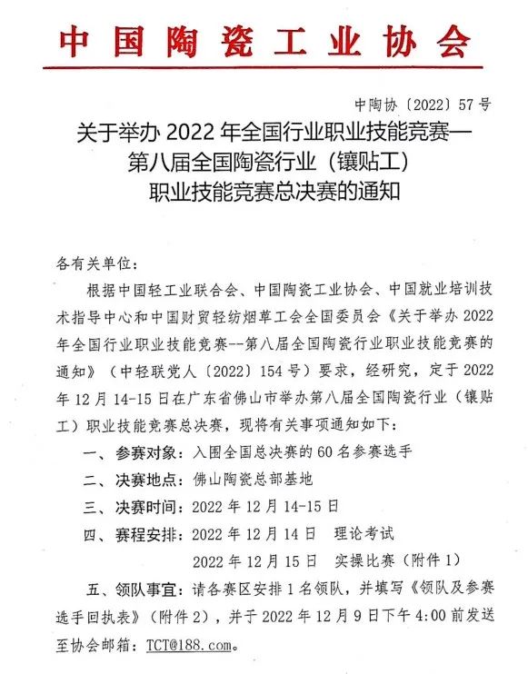 “2022 年全國行業(yè)職業(yè)技能競賽-一第八屆全國陶瓷行業(yè)《鑲貼工)職業(yè)技能競賽總決賽”將于2022年12月14-15日,在佛山陶瓷總部基地舉行,歡迎各路選手、行業(yè)同仁前來觀戰(zhàn)?。?!